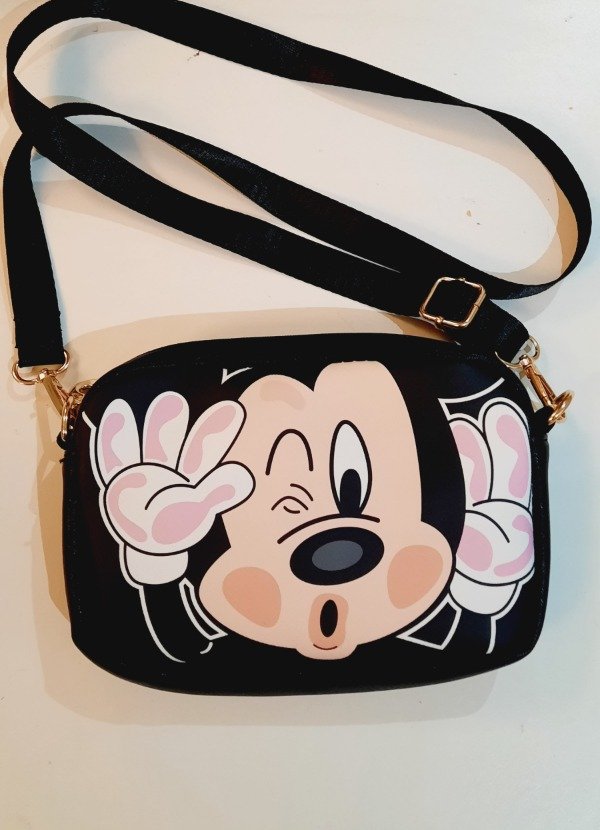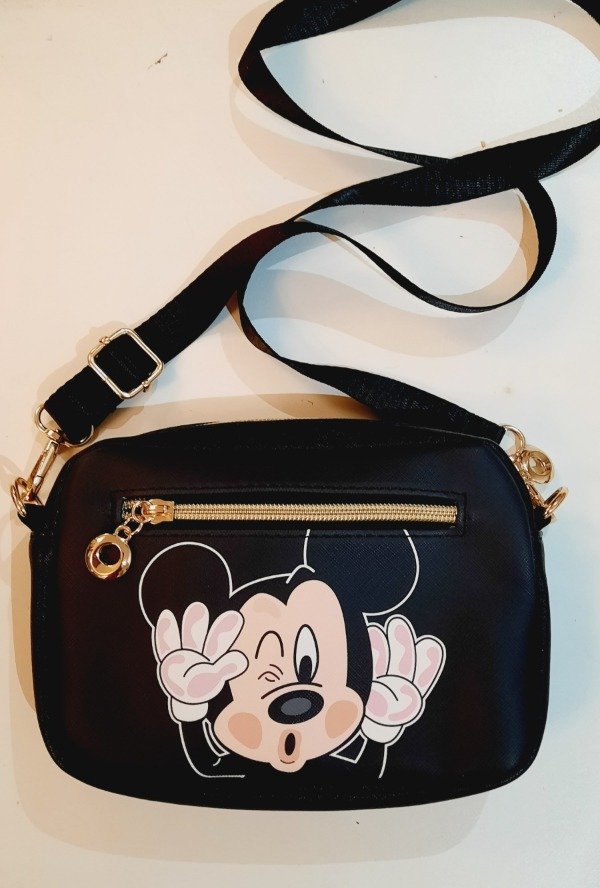 Carterita bandolera mickey negro con cierre reforzado dorado , bolsillo trasero tmb con cierre