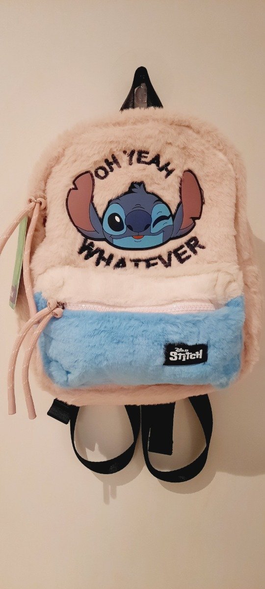 Mochila peludita rosa detalles de stitch en etiqueta y cierres medidas 20 x 30 aprox